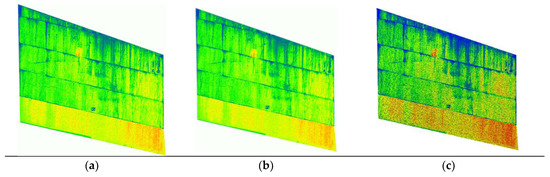 Octovis [50], a viewer program with a 3D tool kit, was used to identify the shape information of the generated octree. The number of points on the target wall was originally 1,367,274, and the file size was 19.56 MB and it was reduced to about 30%, 50%, and 80% as presented in the Table 5 to confirm that cracks could be detected even at a small number of points. Also, the extracted scan images according to the compression ratio is shown in Figure 12.