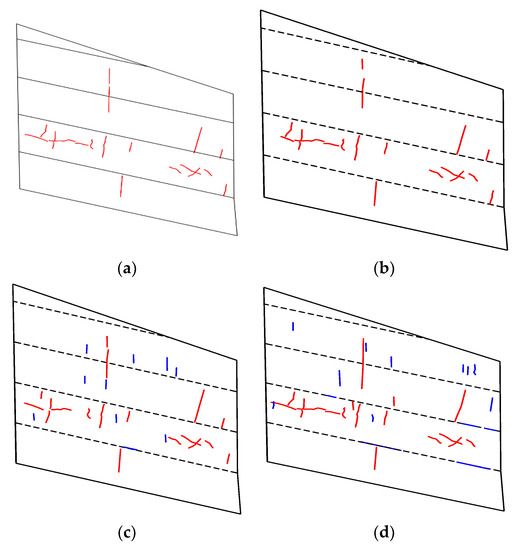 The cracks identified by the proposed method for three cases. (a) Crack map by visual inspection; (b) Original image; (c) Case 1; (d) Case 2.