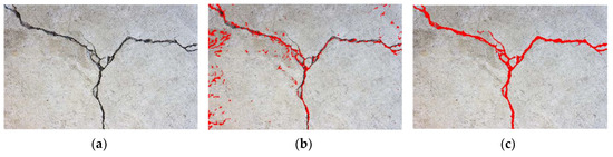 First, Talab’s method for a clear crack case with some stains was applied and compared with the proposed one, as presented in Figure 15. The results in Figure 15 show that Talab’s method detected some undesirable areas such as stains, making it difficult to distinguish them from the major and minor cracks on the concrete surface.