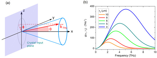 where is the effective nonlinear coefficient of the medium, and the wavevectors’ mismatch depends on the refractive indexes for the optical pump fields , the refractive index for the THz wave is , and the angle is formed by the emitted THz wave with respect to the x direction (see Figure 1a): .