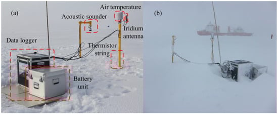 As shown in Figure 1a, an observing system was deployed on Arctic sea ice on 9 August 2016 during the 2016 Chinese National Arctic Research Expedition. This observing system was designed by the Polar Research Institute of China (PRIC) and Taiyuan University of Technology (TYUT), which included an acoustic sounder (SR50A, Campbell, Camden, NJ, USA) and an underwater sonar (PSA-916, Teledyne Benthos, North Falmouth, MA, USA) to measure snow depth and ice thickness, a 4.5 m long thermistor string, a temperature sensor (HMP155A, Vaisala, Vantaa, Finland), a battery unit, a data logger developed by TYUT, and an Iridium system. The power of this system was only dependent on the battery unit (13.5 V, 75 Ah). Blizzard weather occurred three days after the observation system was deployed (Figure 1b); these storms occur frequently in the Arctic Ocean. In Figure 1b, we can see that the situation in which the observing system was deployed had dramatically changed, increasing the possibility of equipment damage.