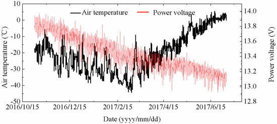 The observing system observed the entire ice season for approximately 11 months. As shown in Figure 2, air temperature and power voltage from October 2016 to July 2017 are presented, which covered the period of the polar night. The sampling interval of air temperature and voltage was one hour.