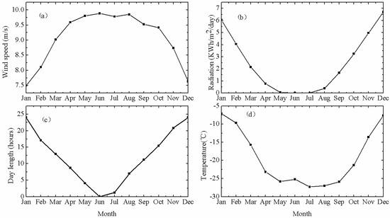 A power system of the special observation equipment for the polar regions should fully consider the characteristics of the polar natural environment. China’s Zhongshan Station was selected as the one of the deployment locations of the observing system in Antarctica, and its monthly meteorological data (69.37° S, 76.38° E) in Antarctica in recent years are shown in Figure 3, including monthly average wind speed, radiation, day length, and air temperature. The meteorological data in Figure 3 were obtained from NASA’s atmospheric science data center. In Figure 3a, we can see that the distribution of wind speed was approximately parabolic, and monthly average wind speed for the whole year was greater than 7.50 m/s. The maximum monthly average wind speed (9.88 m/s) was in June. The minimum monthly average wind speed (7.50 m/s) was in January. The monthly mean wind speed was consistent with seasonal changes in the southern hemisphere. The average monthly wind speed reached 9.02 m/s. Thus, wind resources around Zhongshan Station were relatively rich to establish power-supply systems for wind-power generation. Figure 3b shows the monthly average radiation near Zhongshan Station. Radiation decreased from 6.05 KWh/m2/day in January to 0.05, 0.00, and 0.01 KWh/m2/day in May, June, and July, respectively. After that, radiation rose from August until December, reaching maximum value (6.69 KWh/m2/day) in one year. The average monthly radiation was 2.49 KWh/m2/day. The results of monthly average day length are shown in Figure 3c. Similar to the results of the radiation shown in Figure 3b, day length decreased from January (24 h) to the minimum value of 0 h in June. Then, day length increased from July until December, reaching the maximum value of 24 h. As can be seen from Figure 1c, Zhongshan Station was in the polar day from December to January of the following year. In June and July, Zhongshan Station was in the polar night, and solar-radiation energy was equal to zero. Average monthly day length was 12.2 h. Figure 3d shows the monthly average air temperature near Zhongshan Station. The maximum monthly mean temperature was −7.13 °C in January. The minimum monthly mean temperature was −27.3 °C in July. Average monthly air temperature was −19.1 °C.