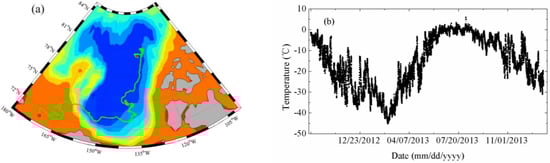 We also planned to deploy our observing system in the Arctic Ocean to observe sea ice parameters. The drift trajectory (Figure 4a) of an Ice Mass-Balance (IMB) buoy and the observed temperature data (Figure 4b) from 10 September 2012 to 16 January 2014 are shown in Figure 4. Figure 4b shows that maximum temperature was 5.93 °C on July 2013. Minimum temperature was −45.06 °C on February 2013. Average temperature was −15.34 °C.