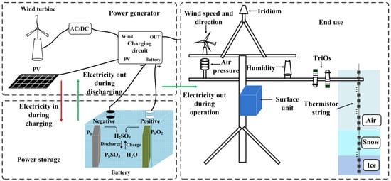 Wind and solar energy are unpredictable and weather-dependent in the polar regions. An energy-storage system (ESS) is necessary as a reliable back-up to the observing system in order to store excess energy and then release the power to guarantee periods when a net load occurs. Some integrated wind–PV–battery hybrid systems and power-management strategies were proposed to offer a lower cost and higher efficiency [16]. Isolated power systems built by hybridizing renewable-power sources (wind and solar) in Indian used a battery as appropriate energy storage [17]. Studies [18,19] have developed an energy-management strategy and new photovoltaic solar structure for a renewable-energy system for rural communities to meet load demands. The observation equipment used in cold regions often uses batteries as power storage. However, batteries are sensitive to low temperatures, which can decrease their capacity. Therefore, a hybrid wind- and solar-energy system is also temperature-dependent.
