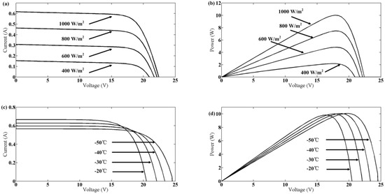 Based on the established PV panel parameter model as shown in Equation (3), the temperature was set 0 °C. Simultaneously, radiation intensities of 1000, 800, 600, and 400 W/m2 were selected for the PV panel. Then, the output characteristics were tested (Figure 6). Figure 6a shows the open circuit voltage and short circuit current of the PV panel. At the same temperature, as radiation intensity decreased, the open circuit voltage and short circuit current of the PV panel would gradually decrease. Figure 6b shows the output power of the PV panel. The output power of the PV panel also increased as the radiation intensity increased. When radiation intensity was kept constant at 1000 W/m2 and ambient temperature was raised from −50 °C to −20 °C, the output characteristics of the PV panel were as shown in Figure 6c,d. Figure 6c shows that the open circuit voltage of the PV panel increased as the temperature decreased, but the short circuit current decreased. Figure 6d shows that the maximum power point of the PV panel increased with decreasing temperature. Although the short circuit current of the PV panel was reduced, the maximum output power point increased in the low-temperature environment.