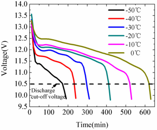 In the experiment, to calibrate battery capacity, we placed the self-developed lead–acid battery into a GDJS series low-temperature test chamber, which can provide stable environmental temperature. The temperature range for the experiment was from −50 °C to 0 °C. The ideal capacity of the battery is 13.6 V and 75 Ah under a normal temperature environment. We discharged the battery at 7.5 A at different ambient temperatures (−50–0 °C) to determine battery capacity. The voltages of battery were measured by an oscilloscope (MSO70404C, Tektronix, Beaverton, OR, USA), and the discharge cut-off voltage was 10.5 V. The interval for the experimental temperature change was set to 10 °C. At each temperature in the experiment, the low-temperature test chamber maintained the temperature at which battery voltage reached the discharge cut-off voltage. We took the average values of the voltage to minimize statistical error and uncertainty.