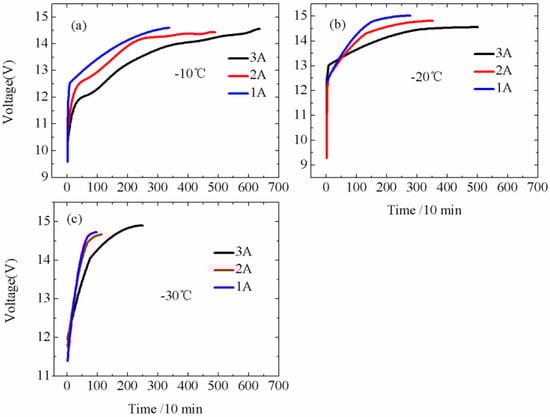 (a–c) Charging curve for the lead–acid battery at temperatures of −10, −20, and −30 °C under the charging currents of 1, 2, and 3 A, respectively.