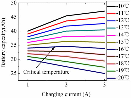 Based on the experimental results in Section 3.1 and Section 3.2, the magnitude of the charging current would affect the actual capacity of the battery at different temperatures. The relationship between battery capacity and charging currents reversed between −10 °C and −20 °C. The critical ambient temperature of the relationship between battery capacity and charging currents was therefore tested experimentally. The temperature range for the experiment was from −10 °C to 20 °C. The interval of the experimental temperature was set as 1 °C. The experimental method and other experimental conditions were the same as those in Section 3.2.