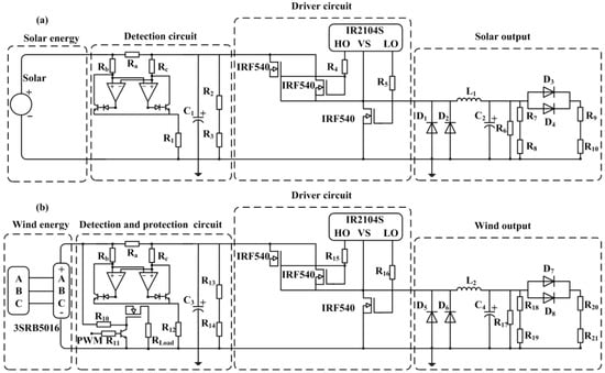 The main circuit of the solar and SWT charging circuit is the Buck circuit. The driver circuit is shown in Figure 11 and was developed by the IR2104S (International Rectifier, El Segundo, CA, USA).