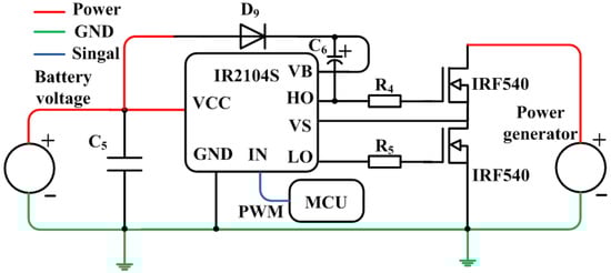 C5 is a capacitor with value of 100 nF. D9 is a low power-consumption Schottky diode SK34 (Diodes Incorporated, Plano, TX, USA), and C6 is a 1 μF tantalum capacitor that can be considered as a bootstrap capacitor. Current limiting resistors R23 and R24 are designed to have a resistance of 2 KΩ. The IN is connected to the PWM port of the MCU, and the LO has the same polarity as the pin IN, while the HO has the opposite polarity. The function of the drive circuit can be described as follows: After inputting the PWM at pin IN, (1) when the HO is low, the LO is high. At this time, the IRF540 connected to R24 is turned on and grounded, and the VCC is charged to C6 through D9, (2) When the HO is high, the LO is low. At this time, the VCC and the voltage of C6 are output from the HO, thereby controlling the turn-on and turn-off of the IRF540 connected to R23.