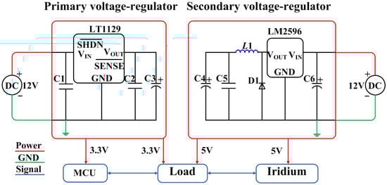 The ADS1100 (Texas Instruments, Dallas, TX, USA) was selected as the core of the ADC circuit. This circuit was assembled compatible with I2C serial interfaces, and has a simple circuit structure. The auxiliary circuit (Figure 12) contains two levels of voltage conversion: The primary and secondary voltage regulators. The primary voltage regulator (LT1129, Analog Devices Inc., Norwood, MA, USA) generates 3.3 V at supply of 12 V by a plurality of battery units. The secondary voltage regulator (LM2596, Texas Instruments, Dallas, TX, USA) generates 5 V at a supply of 12 V to fulfill the requirements of the iridium circuit.