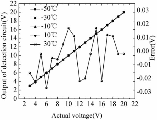 We placed the detection circuit into the GDJS series high–low-temperature test chamber providing a stable environmental temperature over the range of −50 °C to 30 °C. The input voltage of the experiment was generated with programmable power-supply E3631A (Agilent, Santa Clara, CA, USA) to generate voltages from 2 V to 22 V. The output of the detection circuit was measured by an oscilloscope (MSO70404C, Tektronix, Beaverton, OR, USA). The interval of the experimental temperature was 20 °C. The interval of the measured voltage was set to 1 V. At each temperature, the high–low-temperature test chamber maintained the temperature for 20 min, during which measurements were repeated 300 times. We took the average values to minimize statistical error and uncertainty.