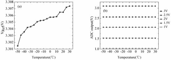 In the temperature-dependence experiment of the ADC circuit, we also placed the ADC circuit into the high–low-temperature test chamber with the same temperature range. The input voltage of the ADC circuit was generated by a nominal 5 V voltage reference chip and a potentiometer with an input range from 1 to 3 V in intervals of 0.5 V. The results in Figure 14a demonstrate that the minimum value of the reference voltage was 3.302 V at −50 °C, maximum value was 3.308 V at −30 °C, average value of the output was 3.306 V, and standard deviation was 0.0015 V. We calculated the coefficient of variation of the reference voltage as 0.048%. The results in Figure 14b show that the five measured ADC outputs can be considered stable in a temperature range of −50–30 °C.