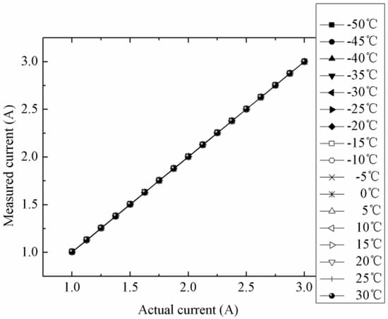 As mentioned above, the evaluation reveals that the low-temperature performance of the detection circuit maintained a strong stability at a temperature range of −50–30 °C. However, we still developed an approach to correct and minimize deviation, because the accuracy of the detection circuit directly affects the operation effect of the charging strategy. The relationship between output current of the detection circuit ID(T) and corrected current Iout(T) could be approximated as follows: