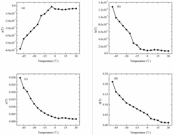 The coefficients a(T), b(T), c(T), and d(T) decreased approximately in a parabolic manner with increase of temperature (Figure 16). The maximum and minimum a(T) were −3.4 × 10−7 at 30 °C and −5.83 × 10−7 at −50 °C, respectively. The maximum and minimum values of b(T) were 1.28 × 10−5 at −50 °C and 7.47 × 10−7 at 30 °C, respectively. The maximum and minimum values of c(T) were 0.0298 at −50 °C and 0.0017 at 30 °C, respectively. The maximum and minimum values of d(T) were 0.211 at −50 °C and 0.012 at 30 °C, respectively. The value of coefficients a(T), b(T), c(T), and d(T) at the nonmeasured temperatures could be predicted by interpolation.