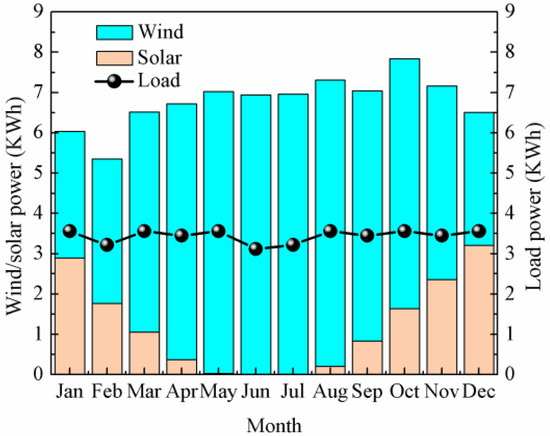 The monthly average PV and WT power generation near Zhongshan Station and monthly average load power are presented in Figure 17. Monthly average radiation-intensity, wind-speed, and air-temperature data were obtained from NASA’s atmospheric science data center. It can be noted that wind-power production dominated the power supply and generated 66.07 KWh in a year. The monthly average maximum (minimum) value of wind power was 7.11 KWh (3.13 KWh) in August (January). Solar power showed strong seasonal fluctuations because of the polar night in June and July. The monthly average solar power of the polar day in January and December was larger at 2.90 and 3.21 KWh, respectively. The minimum value of the monthly average solar power in a year appeared in June and July, which was during the polar night in Antarctica. In contrast, wind energy was considered to be significant from May to August. The power generation of the PV and WT in Zhongshan Station showed good monthly characteristics. Monthly load demands of the observing system were basically the same. The maximum and minimum load demands were 3.11 KWh in June and 3.56 KWh in January, March, May, August, October, and December, respectively. The minimum power output of the power-supply system was 5.35 KWh in February, which can satisfy the power demands of the observing system in normal operation.
