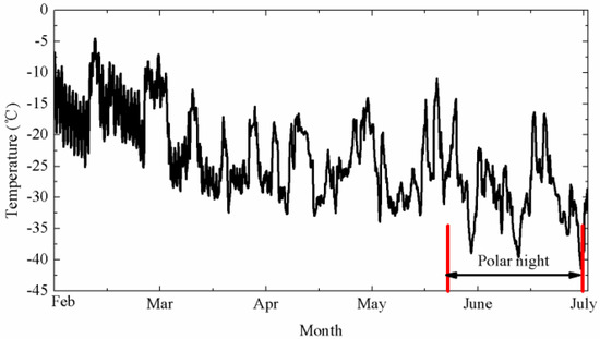 Daily air temperature measured by the observing system from 6 February 2017 to 9 July 2017 in Zhongshan Station, Antarctica. The area between the red lines is the polar night.