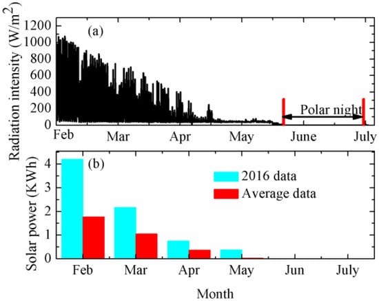 Figure 19 shows the daily radiation intensity and solar power from 6 February 2017 to 9 July 2017, respectively. Overall, radiation intensity continued to decline from 6 February 2017 (Figure 19a). Then, from 27 May to 9 July, radiation intensity was 0 W/m2, which was during the polar night. Although the observation system was initially deployed during the polar day, the intraday variation of radiation intensity was more severe. The minimum value of radiation intensity was 0 W/m2 in the period of polar night. Maximum radiation intensity was 1073 W/m2 on 10 February 2017, which was in the period of the polar day. The average radiation intensity from 6 February 2017 to 9 July 2017 was 114 W/m2.