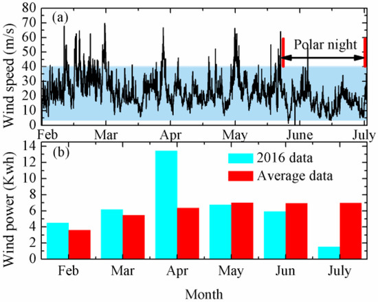 (a) Wind speed measured by the observing system, and (b) monthly wind power generated by the power system and calculated by the average data from 6 February 2017 to 9 July 2017, respectively. Area between the red lines is the polar night. The dark-blue area represents the available wind.