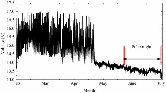The power supply of the observing system is shown in Figure 21. The supply-voltage range required for the observing system to operate normally is from 13 to 20 V. As shown in Figure 21, the voltage of the output of the power system continued to decline from February to July. From the date of deployment to the end of April, the voltage was a fluctuant downward trend owing to the superposition of solar and wind energy. After that, radiation intensity was reduced until it was 0 W/m2 in the polar night, during which wind power was alone as a source of energy. In the operating cycle of the observation system in Antarctica, supply voltage was always higher than 13 V, that is, the power-supply system could guarantee the operation of the observation system in the range of −50–30 °C.