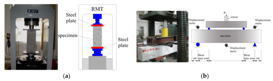 As showed in Figure 2, RX-45-9 industrial box-type resistance furnace (Detianli Electric Furnace Manufacturer Co., Ltd., Jinan, China) was used for the high-temperature installation. And its maximum temperature can reach 950 degrees centigrade. The target temperature was set separately for batch heating based on the design of the specimen. In order to uniformly distribute the temperature inside the specimen, the temperature in high-temperature installation was constant for one hour when the furnace temperature raised to the target temperature. And then, open the furnace door and let the specimens fall to room temperature under natural conditions. The temperature in the test furnace was recorded during the test. The heating curves was showed in Figure 3. After the specimens fall to room temperature, the test block and column specimens were loaded by RMT-201 test machine (Institute of Rock and Soil Mechanics, Chinese Academy of Sciences, Wuhan, China) which is showed in Figure 4a. Displacement control loading was adopted in the test. And the loading ratio was about 0.01 mm/s. The load-deformation curve was obtained by the acquisition system of installation. On the other hand, beam specimens were loaded by two points symmetrically. And the specimens were tested under the displacement–force mixed control. Before the pre-estimation of the ultimate load, force control was used in the test, and its step length and holding time for each level are 10 kN and 5 min, respectively. Then, when the specimen was approaching the ultimate load, displacement control loading was applied until the specimen was destroyed. And its displacement gradient was 0.5 mm. The loading installation was showed in Figure 4b.