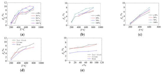 Figure 6d shows that the mean of βm in each group at the same elevated temperature. According to the Figure 6d, mass loss ratio of rectangular prisms specimens increases the most significant. Mass loss ratio of SRRAC beams increase the least. Figure 6e shows that the mean of mass loss ratio of similar specimens at the same replacement percentage. According to the Figure 6e, mass loss ratio increases with replacement percentage increases. Meanwhile, mass loss ratio of replacement percentage at 100% is about 1.4 times that of the replacement percentage at 0%. Because a lot of old cement paste attach on the surface of recycled coarse aggregate. And then, more water is absorbed by the old cement paste during the stirring process. Therefore, the more recycled coarse aggregate has, the more the moisture of recycled concrete absorbs. Thus, water evaporation increased in recycled concrete after exposure to elevated temperature, and its mass loss ratio increases.