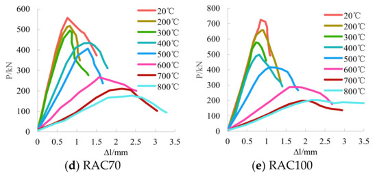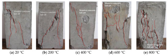 Figure 13 shows the degradation on bearing capacity of specimens after exposure to different elevated temperature. As seen from Figure 13a–d, compressive strength of test blocks after high temperature is deeply downtrend as the temperature ascend. The bearing capacity decreases by about 18% in the scope from 200 degrees centigrade to 400 degrees centigrade. And bearing capacity decreases by 48% when exposure to elevated temperature is at 600 degrees centigrade. Meanwhile, bearing capacity decreased by 74% when exposure to elevated temperature is at 800 degrees centigrade.