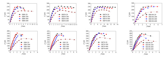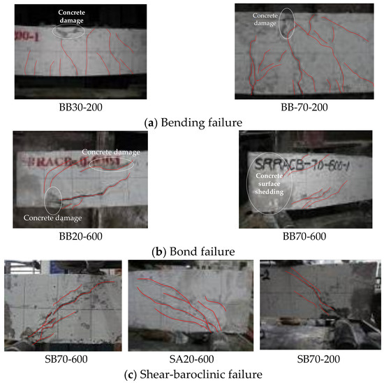 Bond failure process is as follows: Longitudinal bonding crack was found near the compressive zone of section steel on the outside flange when the external load is at 0.65 Pu. Finally, the concrete to the outside of the bonding crack is split, then the specimen is destroyed. The failure modes of some specimens are shown in Figure 9. The BBi-j, SAi-j and SBi-j are used to represent corresponding pictures. And SA is shearing beam, and its span-to-depth ratio is 2.0; BB mean bending beam, and its span-to-depth ratio is 1.2. And i and j are replacement percentage and temperature, respectively.
