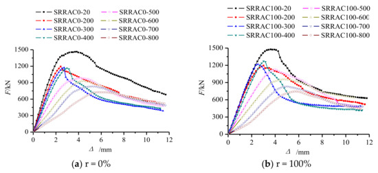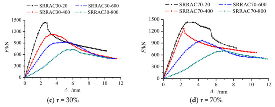 It is found that the failure process and failure mode of SRRAC columns are mainly related to the highest temperature after observing the loading process of SRRAC columns under axial compression. The failure process and mode of specimens at different replacement percentage are similar to each other at the same temperature. The failure process of specimens presents elastic stage, crack stage and failure stage. The mode and failure process of specimens after exposure to elevated temperature are as follows: The higher the temperature is, the earlier the crack appears and penetrates. The failure mechanism of the specimen is different from that of the room temperature specimen when the temperature is higher than 500 degrees centigrade. It is not the crushing failure of edge concrete. But the concrete cover falls off, then SRRAC columns damage in advance before reaching the peak load. The higher the temperature is, the earlier the concrete falls off. The failure modes of the specimen are shown in Figure 8.