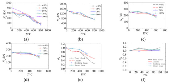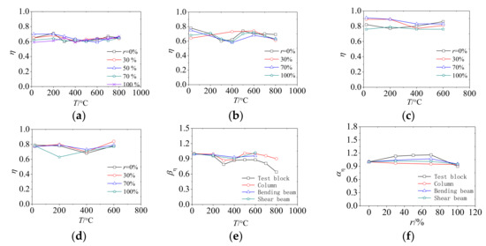 Figure 19 shows the energy dissipation factors of each component after exposure to different elevated temperature. As seen from Figure 19a–e, the law of energy dissipation factors of each component is similar to that of ductility factor. Energy dissipation factor decreases with the increase of temperature when T is lower than or equal to 400 degrees centigrade. When T is equal to 400 degrees centigrade, the energy dissipation factor of test block, column, bending beam and shear beam decrease by 13%, 11%, 7% and 10%, respectively. The energy dissipation factor increases slightly when T is from 400 degrees centigrade to 600 degrees centigrade. The energy dissipation factor decreases steeply when T is above 600 degrees centigrade. When T is equal to 800 degrees centigrade, the energy dissipation factor of test block and column decreases 36% and 10%, respectively. As seen from Figure 19f, the energy dissipation factor of each component is not obviously affected by the replacement percentage. The energy dissipation factor varies from −10% to 16% with replacement percentage increases.