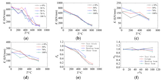 The law of secant stiffness degradation of specimens is shown in Figure 14. And secant stiffness is the secant modulus at 0.4 Np. As seen from Figure 14a–e, the laws of stiffness degradation of the specimens are similar to that of bearing capacity. But the degradation of stiffness is larger than that of bearing capacity. The bending stiffness of the beam deteriorated most slowly. Bending stiffness degradation rate is about 49%, when T is 600 degrees centigrade. The axial compressive stiffness of the prism test block deteriorated most rapidly. The axial compressive stiffness degradation rate is about 70% when T is 600 degrees centigrade. And the axial compressive stiffness degradation rate is about 88% when T is 800 degrees centigrade. According to the degradation trend, the stiffness degradation rate of SRRAC components under axial compression is larger than that of the flexural components after exposure to elevated temperature. Stiffness degradation coefficient (βK) of compression components is about 5~21% less than that of the flexural member when T is at 200 degrees centigrade to 600 degrees centigrade.