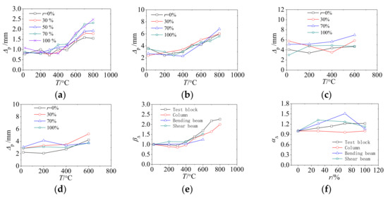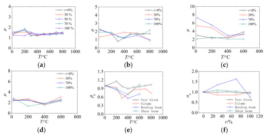 Figure 17 shows the displacement ductility factor of each component after exposure to different elevated temperature. As seen from Figure 17a–e, the displacement ductility coefficient of each component fluctuated slightly up or down as exposure to elevated temperature rises. Generally speaking, the ductility factor of the four types specimens decreases with increasing temperature when T is between 200 degrees centigrade and 400 degrees centigrade. When T is equal to 400 degrees centigrade, the displacement ductility factor of test block, column, bending beam and shear beam decrease by 10%, 28%, 44% and 31%, respectively. The displacement ductility factor of each component varies from −25% to 4% when T is higher than 400 degrees centigrade.