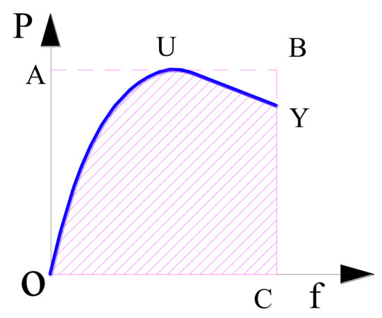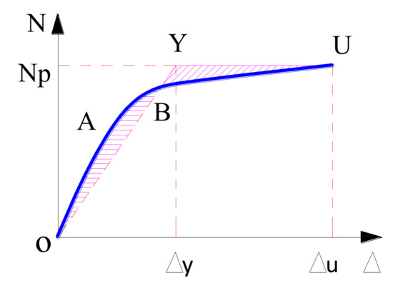 Ductility (μ = ∆u/∆y) is calculated according to the load-deformation curve. And ∆u is the value of deflection at 0.85 times Np, and the maximum deformation is taken to be ∆u when the load falls below 0.85 Np. ∆y is the value of initial yield deformation and calculated by the equivalent energy method. As shown in Figure 16, the dimension of OAB is equal to the dimension of YUB.