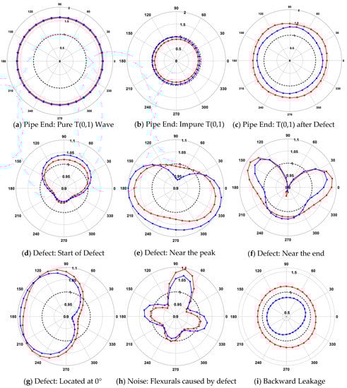 In the previous section, it was demonstrated that in the case of flexural waves, high-order sinusoidal variation along the pipe’s circumference will be created. In ideal scenarios, where a perfect axisymmetric wave hits a perfect axisymmetric feature, the received amplitude in each transducer must be the same. However, due to the imperfections of the transducers and the testing conditions, there will be variance along each of the received amplitudes from the transducers; nonetheless, they all will have the same phase. Similar to the pipe ends, defects would generate a significant amount of torsional mode. However, they also do create flexurals with respect to the defect size and location. For signals coming from the backward direction, it is observed that the phases would practically be the inverse of each other for each transducer.
