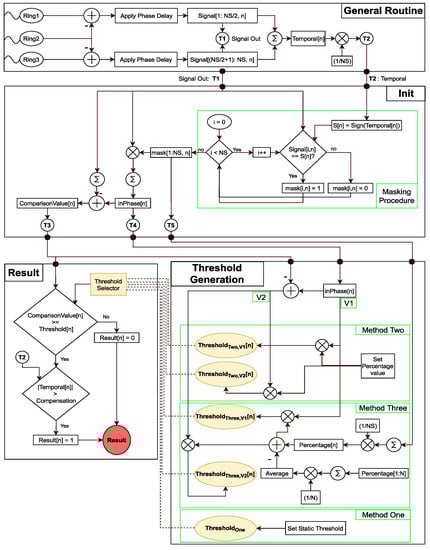 Doing so removes the need for user input, and provides a more accurate thresholding with regard to the phases of the signals in each sample; the higher number of the same phase signals means a higher percentage value for the sample, which leads to a higher chance of detection. The formula for the first version (V1) and second version (V2) of this method can be achieved by substituting the new percentage achieved from Equation (12) in Equation (8) or Equation (9):