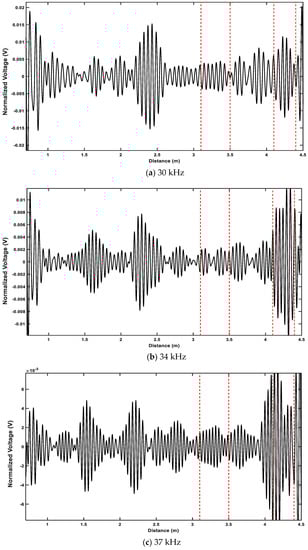 Figure 5 shows the baseline signals achieved from the same pipe with no defects, with excitation frequencies of (a) 30 kHz; (b) 34 kHz; and (c) 37 kHz. As can be seen, even though there are no defects in the pipe, the baseline signal is highly polluted by the coherent noise. The first defect signal is expected to be received approximately three meters away from the tool test, between the first and second red dotted lines. The second defect is expected to be located approximately four meters away, between the third and fourth red dotted lines. Three major conclusions can be drawn with regard to the baselines: