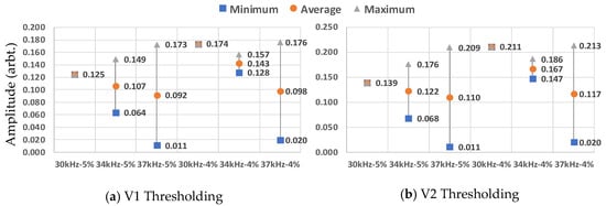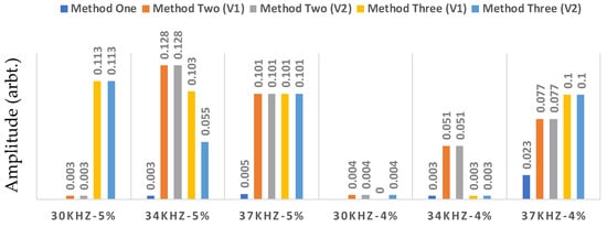 With regard to these results, method three (V2) is the best method since the threshold can be determined automatically, and it achieves the highest safe zone margin. The tests prove that this method can detect defects using both 34 kHz and 37 kHz, depending on the existing coherent noise in the defect location. Furthermore, the algorithm is sensitive to the existing coherent noises in the baseline signal rather than the temporal noise in the tests.