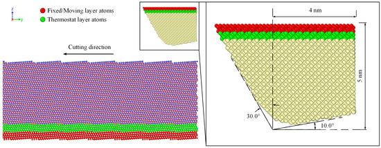 Figure 1 shows the nanocutting MD model of the off-axis 4H-SiC. The model consists of two parts, the diamond cutting tool and the SiC workpiece. The primary geometry parameters of the cutting tool are also shown in Figure 1. The cutting tool with a −30 rake angle and a 10 clearance angle was used in this paper. Since the hardness of SiC is comparable with a diamond, the cutting tool was not treated as a rigid body [7]. The atoms marked in red in the SiC workpiece are the fixed layer atoms, which provide mechanical support for the workpiece to prevent it from translation motion. The red atoms in the cutting tool are the moving layer atoms that drive the cutting tool moving at a constant speed. The atoms in green are the thermostat layer atoms, which prevent the workpiece and cutting tool from melting. The Nose–Hoover thermostat method was applied. The thickness of the fixed and thermostat layers in the SiC workpiece was 1.0 nm for both, and the thickness of the moving and thermostat layers in the cutting tool was 0.35 nm for both. Periodic boundary conditions were applied in the directions of x- and y-axis. Figure 2 shows three different workpiece models used in the simulations. Figure 2b is the on-axis SiC model. The lattice directions were [11−20], [−1100] and [0001] along the positive x-axis, positive y-axis, and positive z-axis, respectively. The typical off-axis angles are 4 and 8. We chose a 4 off-axis angle in this paper, since a low off-axis angle is preferable to reduce cost, especially for large wafers. Figure 2a is the off-axis SiC model, where the c-axis rotates 4 toward [1−100]. Figure 2c is the off-axis SiC model, where the c-axis rotates 4 toward [−1100]. These models were used to investigate the influence of lattice orientation on nanocutting. Other parameters used in the simulations are listed in Table 1.