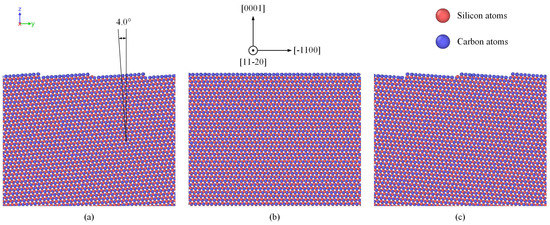 Three different silicon carbide (SiC) workpiece models. (a) 4 Off-axis toward [1−100]. (b) On-axis. (c) 4 Off-axis toward [−1100].
