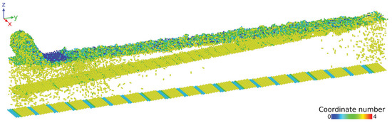 Figure 3 shows the coordinate number of the 4H-SiC workpiece after cutting corresponding to Figure 2a. Cutting speed was 100 m/s, and cutting depth was 1 nm. They are the default cutting parameters unless otherwise stated. Atoms with a coordinate number larger than three were removed. It can be seen that the defect propagates into the workpiece at an angle, and most of the atoms with the coordinate number less than three are located on the surface. The atoms in green and blue on the surface not being fully bonded indicates that these atoms were in amorphous phase after cutting.