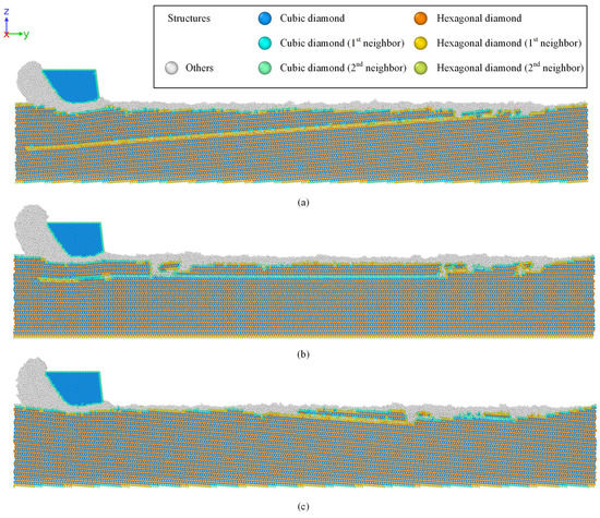 Figure 4 shows the structure transformation of three 4H-SiC workpiece models after cutting. Figure 4a–c correspond to Figure 2a–c, respectively. There are seven kinds of structure types in the workpiece. The atoms with an unidentified structure type were classified as “others”. Most of them were in the amorphous phase. The atoms with a cubic diamond structure and the ones with a hexagonal diamond structure were classified as “cubic diamond” and “hexagonal diamond”, respectively. The atoms being a first neighbor of a “cubic diamond” atom were classified as “cubic diamond (1st neighbor)”. Other structure types were defined in a similar way. It can be seen that defects all propagated in the basal plane. The defect in Figure 4a propagated deeper than the rest, and the defect in Figure 4c stopped propagating on the surface. Figure 5 presents the structures transformation in the defect region of three models after cutting. Figure 5a–c correspond to Figure 2a–c, respectively. The dashed line is the slip plane, and the yellow stick is the displacement vector. It can be seen that the atoms in the on-axis SiC model above the slip plane moved downward due to the compression, except the carbon atoms near the slip plane. The stacking sequence of Si was changed from -ABAC- to -ABBA- due to shear stress, which indicates that the defect in the basal plane is a stacking fault. The Si–C bonds crossing the slip plane were broken, and Si–Si bonds were formed after cutting. The stacking fault in the basal plane and the bond reconstrcution were also found in the off-axis models. The difference is that the stacking sequence in the off-axis models was changed from -ABCB- to -ABBA-, which means the atoms above the slip plane in the off-axis models moved twice as long than that in the on-axis model.