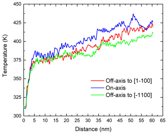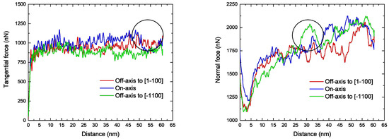 Figure 6 shows the tangential and normal forces of the cutting with different lattice orientations. Tangential force is the component of a cutting force parallel to the xy-plane, and normal force is the z-component of the cutting force. Tangential force increases rapidly at the beginning of cutting, and then it grows with fluctuations as chip forms. The sudden decrease in the tangential force of on-axis model is marked with a circle. It is induced by the structure transformation on the surface of the on-axis model. Normal force decreases at the beginning and then increases with the cutting tool moving forward. The peak in the normal force of the off-axis model corresponding to Figure 4c is marked with a circle. As the defect propagates to the surface, normal force increases gradually. It decreased when the defect vanished on the surface. Figure 7 shows the temperature of SiC workpieces with different lattice orientations during cutting. The temperature of the on-axis model was slightly higher than the rest. Due to the absence of surface steps, more atoms were involved in the cutting of the on-axis model.