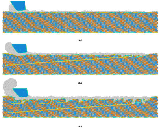 Structure transformation of the workpiece after cutting with different cutting depths. (a) Cutting depth of 0.5 nm. (b) Cutting depth of 1.0 nm. (c) Cutting depth of 1.5 nm.