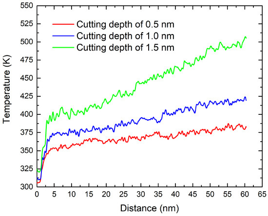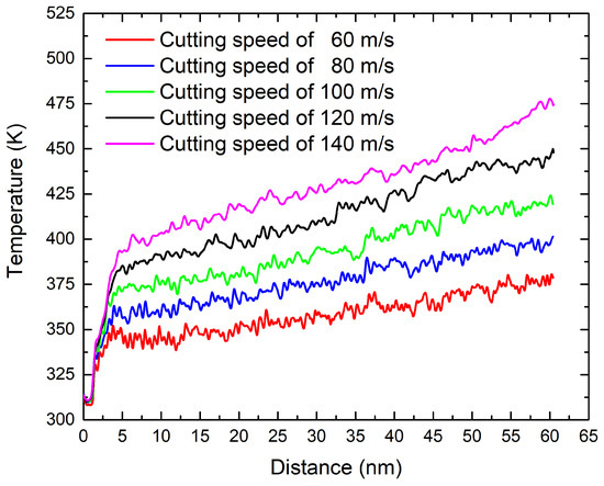 The temperature of the off-axis 4H-SiC workpiece during cutting with different cutting speeds is presented in Figure 11. It can be seen that the temperature of the 4H-SiC workpiece increases with the increase of the cutting speed. The larger the cutting speed is, the fewer the time costs and the less the heat dissipates. And it results in the increases the workpiece temperature. The effect of the cutting speed on the workpiece temperature is evident, while the effect on the structure transformation and the cutting force isn’t. The cutting speed may affect structure transformation and cutting force through temperature. However, the simulation time was relatively small (about 600 picoseconds) and the effects were not captured.