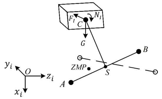 As shown in Figure 1, the position of the body’s CoM () in the inertial coordinate system () is . The gravity of the body is , the inertial force at CoM is , and the inertial moment is . The position of ZMP in the inertial coordinate system is assumed to be ; hence, according to the definition of ZMP,