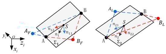 It is difficult to ascertain the actual support plane for some dynamic gaits (trotting, pacing, bounding, etc.) because only two support feet are used most of the time. To solve this problem, the positions of the previous support line, , and the next support line, , are comprehensively considered (for gaits with only one support point, such as gallops, more previous and later support points should be used). The definition of the virtual-support plane is proposed.