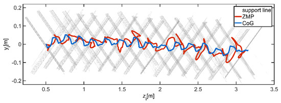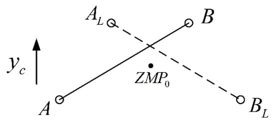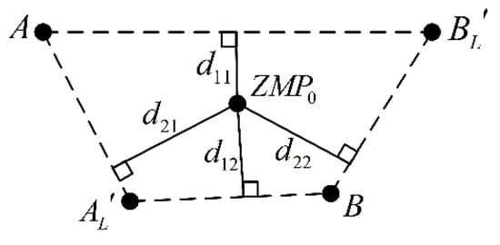 The stability measurement may change suddenly when the current support line disappears and the next support line forms if only the vertical distance between ZMP0 and the current support line (denoted by ) is considered. The vertical distance between ZMP0 and the next support line is represented by , as shown in Figure 10. In practice, should be as short as possible during the first half of the support phase, and should be as short as possible during the second half.
