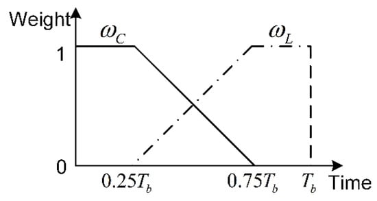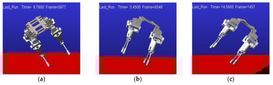 A larger value indicates better motion stability. The value of the coefficients should consider: (1) unification of the order of magnitude of the three terms on the right-hand side of Equation (33) (which are related to the size of the robot); and (2) the importance of each parameter. According to the definitions of , , and , for the dynamically stable gait: