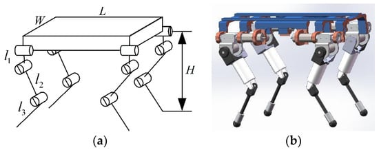 The simplified and mechanical models of the quadruped robot used in this paper are shown in Figure 12. Each leg of the robot has three degrees of freedom.